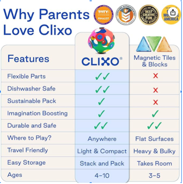 That’s when I realized what makes Clixo special. There’s no single right way to play,and the flexible, magnetic design means kids can twist and shape their ideas however they want….no table or flat surface required.